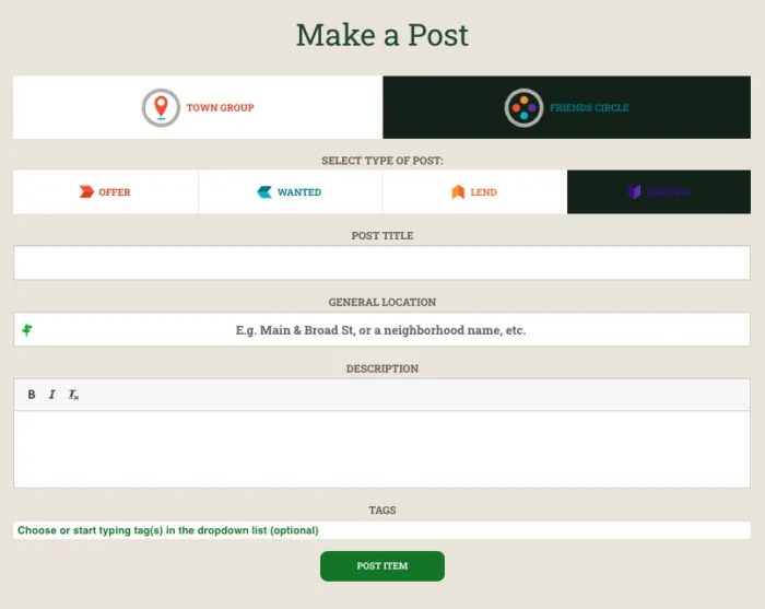 To post in your friends circle, select that button before filling out any information. It’s exactly the same to post an “Offer” or “Wanted” listing. However, in Friends Circles, you can post a “Lend” or “Borrow” listing too. This is a nice way to offer or ask to borrow things from people you know!